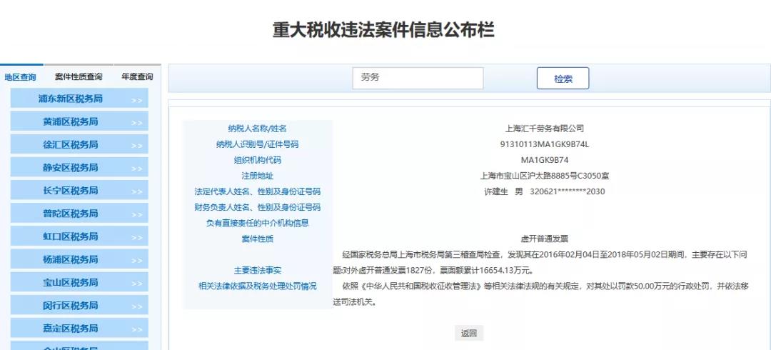最近魔都上海傳來(lái)大消息,多家勞務(wù)公司和人力公司被查,清一色的罰款+移送司法機(jī)關(guān),不難看出勞務(wù)公司一直是稽查重點(diǎn),也是虛開(kāi)的重災(zāi)區(qū),一查一個(gè)準(zhǔn)!