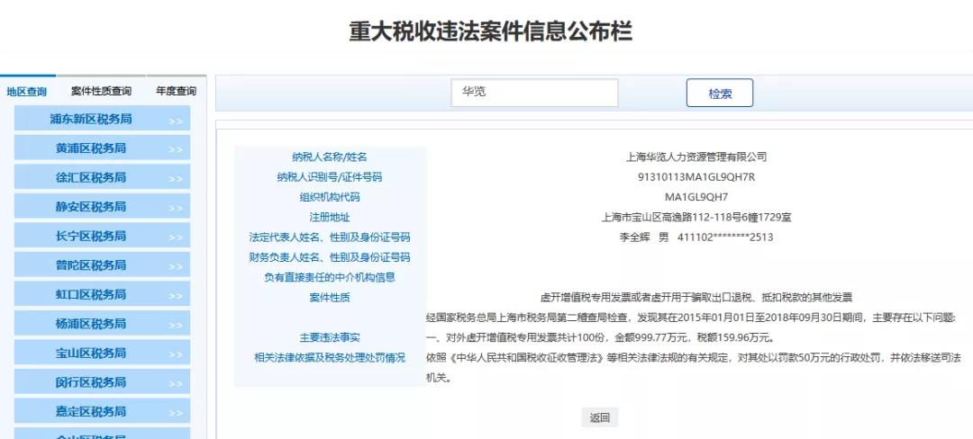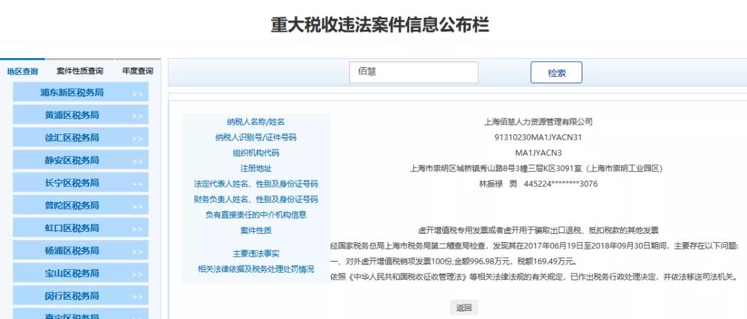 5、上海XX人力資源管理有限公司,經(jīng)國(guó)家稅務(wù)總局上海市稅務(wù)局第二稽查局檢查,發(fā)現(xiàn)其在2017年06月19日至2018年09月30日期間,主要存在以下問(wèn)題:對(duì)外虛開(kāi)增值稅銷(xiāo)項(xiàng)發(fā)票100份,金額996.98萬(wàn)元,稅額169.49萬(wàn)元。依照《中華人民共和國(guó)稅收征收管理法》等相關(guān)法律法規(guī)的有關(guān)規(guī)定,已作出稅務(wù)行政處理決定,并依法移送司法機(jī)關(guān)。