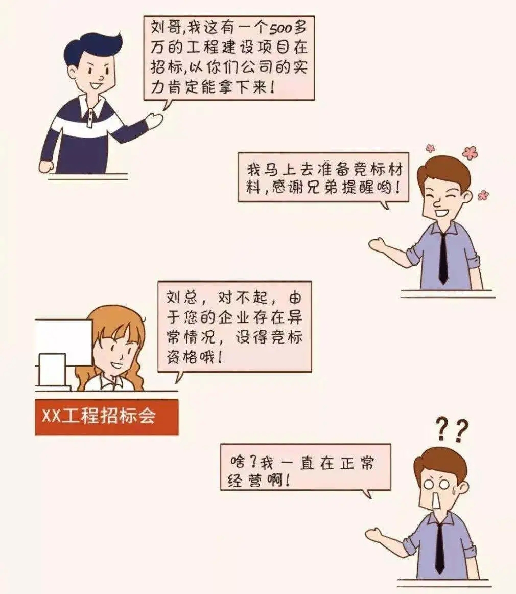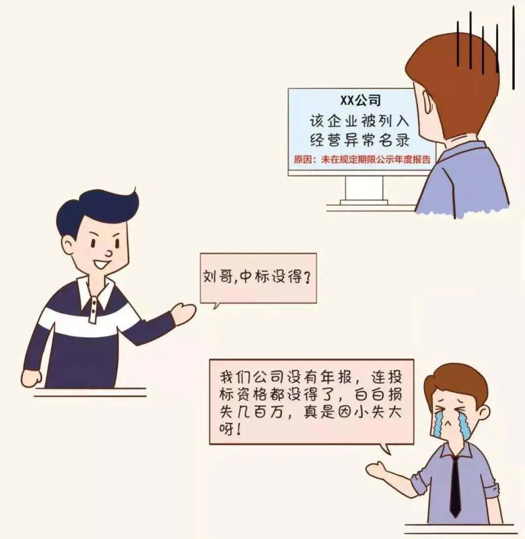 僅剩 7天 02企業(yè)合作信用受疑 現(xiàn)在是信用社會,信用對于人和企業(yè)來說都至關(guān)重要,大家都喜歡和有信用的人交往、合作。 被列入經(jīng)營異常名錄,你看看誰還找你合作! 03經(jīng)營活動受限 經(jīng)營異常名錄信息現(xiàn)在也是 銀行等金融機(jī)構(gòu)貸款、擔(dān)保等金融活動的 參考依據(jù) 老板 你好,我去年年報(bào)忘記報(bào),現(xiàn)在被列入經(jīng)營異常名錄,本來想著在阿里巴巴注冊一個(gè)網(wǎng)店,在網(wǎng)上做點(diǎn)小生意,結(jié)果被告知因?yàn)槠髽I(yè)是經(jīng)營異常名錄,注冊不了,這可怎么辦呀! 你好,首先應(yīng)在國家企業(yè)信用信息公示系統(tǒng)補(bǔ)報(bào)年報(bào),然后再準(zhǔn)備好相關(guān)材料去當(dāng)?shù)厥袌霰O(jiān)管部門申請移出哦。 小編 老板 好的,萬萬沒想到?jīng)]報(bào)年報(bào)的后果竟然這么嚴(yán)重,嚴(yán)重影響了我的經(jīng)營活動,我真是后悔莫及。 是的,企業(yè)被列入經(jīng)營異常名錄,那就有了信用污點(diǎn),必須高度重視哦!對了,2019年度的年報(bào)馬上也要截止啦,請及時(shí)申報(bào)哦。 小編 老板 2019年度的年報(bào)我們公司馬上準(zhǔn)備申報(bào)了,經(jīng)過這次,以后一定不會忘了及時(shí)年報(bào)! 建議您盡早進(jìn)行年報(bào),避免因月底網(wǎng)站擁堵或企業(yè)自身數(shù)據(jù)方面準(zhǔn)備不充分造成年報(bào)延遲。 小編 04列入嚴(yán)重違法企業(yè)名單 最最最嚴(yán)重的后果來啦! 列入經(jīng)營異常名錄三年還沒有履行信息公示義務(wù)的企業(yè),將被列入嚴(yán)重違法失信企業(yè)名單 企業(yè)五年內(nèi)不能申請移出嚴(yán)重違法失信名單,法定代表人、負(fù)責(zé)人也將受到牽連,三年內(nèi)不得擔(dān)任其他企業(yè)的法定代表人、負(fù)責(zé)人! 企業(yè)一站式服務(wù)平臺 工商注冊、財(cái)稅代賬、審計(jì)評估、稅務(wù)籌劃、商標(biāo)專利、資質(zhì)審批、人才獵頭、人才報(bào)名、金融保險(xiǎn)、信用評級、法務(wù)咨詢、項(xiàng)目申報(bào) 公司網(wǎng)站:m.jxgy888.cn 聯(lián)系方式:400-0551-976 合肥總部:安徽省合肥市南一環(huán)與馬鞍山路交口恒興廣場A座24樓 分部:合肥市行政服務(wù)中心一樓“萬業(yè)公司代理窗口”(工商局窗口正對面) 分部:合肥市瑤海區(qū)行政服務(wù)中心一樓“萬業(yè)公司代理窗口”(工商局窗口正對面)