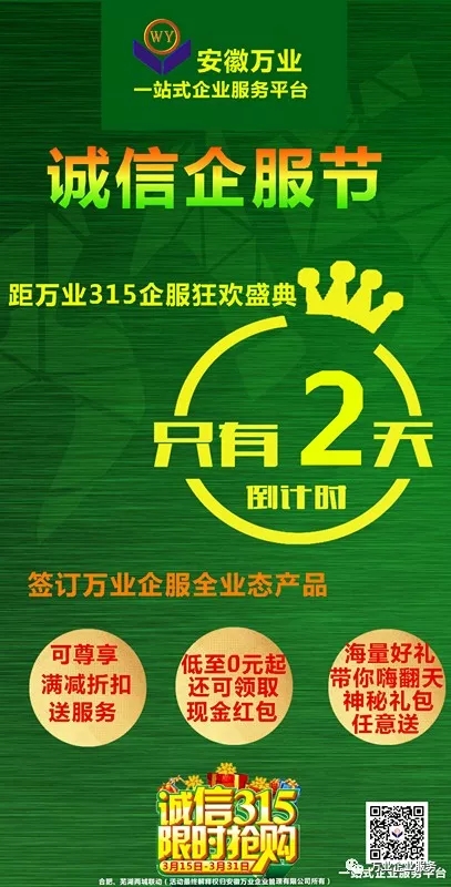 315來源 315即國際消費者權益日,定于每年的3月15日,因為在1962年的3月15日時任美國總統的約翰·肯尼迪在美國國會發表《關于保護消費者利益的總統特別咨文》一文,文中首次提出了著名的消費者四項權利。最早由國際消費者聯盟組織于1983年確定,目的在于擴大消費者權益保護的宣傳,使之在世界范圍內得到重視,促進各國和地區消費者組織之間的合作與交往,在國際范圍內更好地保護消費者權益。 現為了響應315誠信服務消費者的號召,安徽萬業特推出315企服節盛典活動。 距315企服節盛典還有2天 誠信企服節 即將到來! 重磅驚喜 萬業公司“3.15誠信企服節”重磅推出:刻章0元,代賬即返現,商標8折,資質送3A,萬元神秘大禮+抽獎活動! 驚喜不 安徽萬業315企服節盛典即將到來,活動中驚喜不斷!您還在等什么?合肥、蕪湖兩城聯動,嗨翻購! 企業一站式服務平臺 工商注冊、財稅代賬、審計評估、財務咨詢、商標專利、資質審批、人才獵頭、人才報名、金融保險、信用評級、法務咨詢、項目申報 公司網站:m.jxgy888.cn 聯系方式:400-0551-976 合肥總部:安徽省合肥市南一環與馬鞍山路交口恒興廣場A座24樓 分部:合肥市行政服務中心一樓“萬業公司代理窗口”(工商局窗口正對面) 分部:合肥市瑤海區行政服務中心一樓“萬業公司代理窗口”(工商局窗口正對面) 蕪湖分部:蕪湖市鏡湖區偉星時代金融中心610室 (申經理:189-0560-8966)